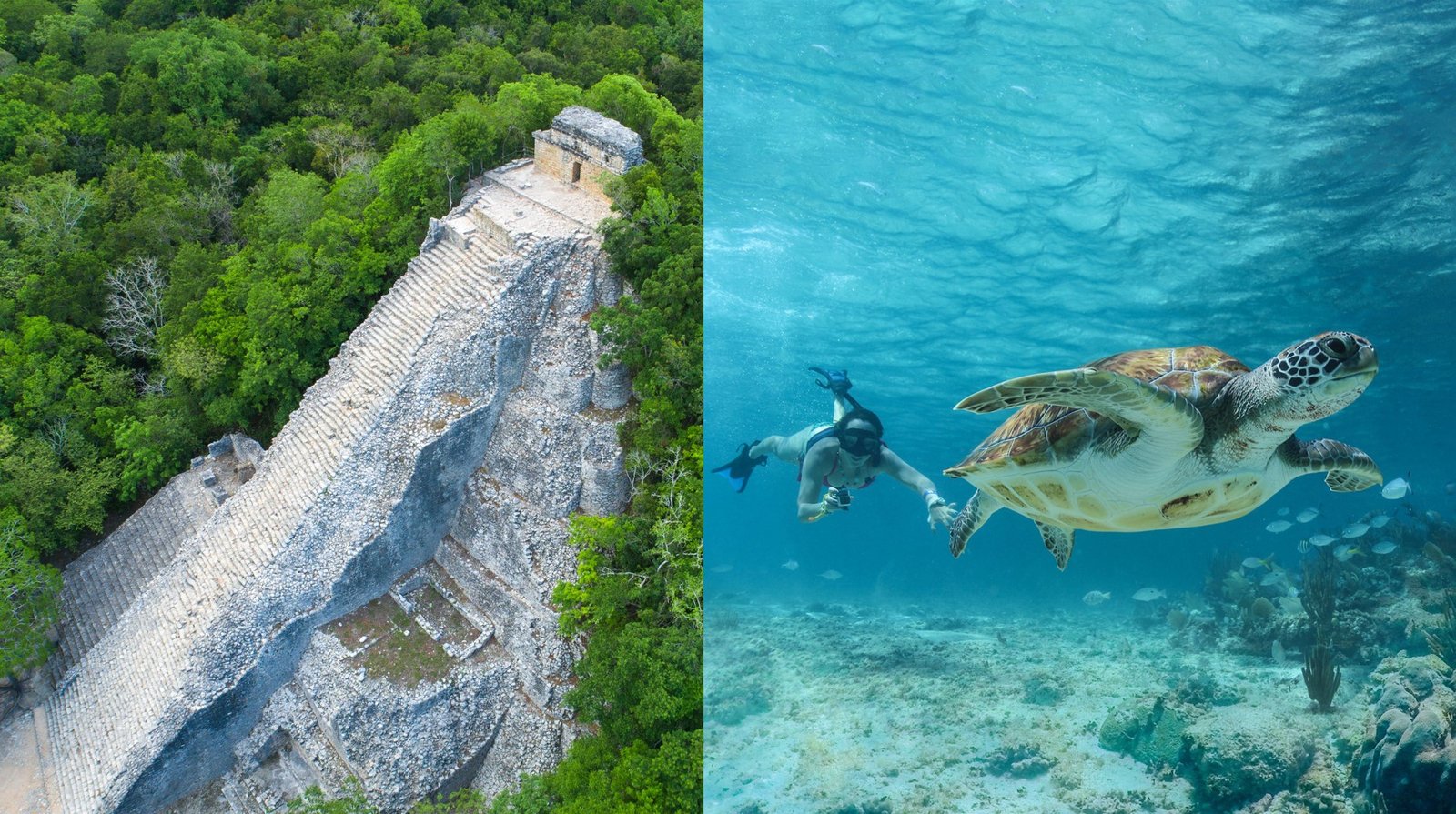 This experience is perfect for you explore Coba archeological site and see it’s 42 meter high temple, Nohoch Mul. Visit the turtle’s natural habitat and swim along the way with them, finish your day with a perfect lunch.